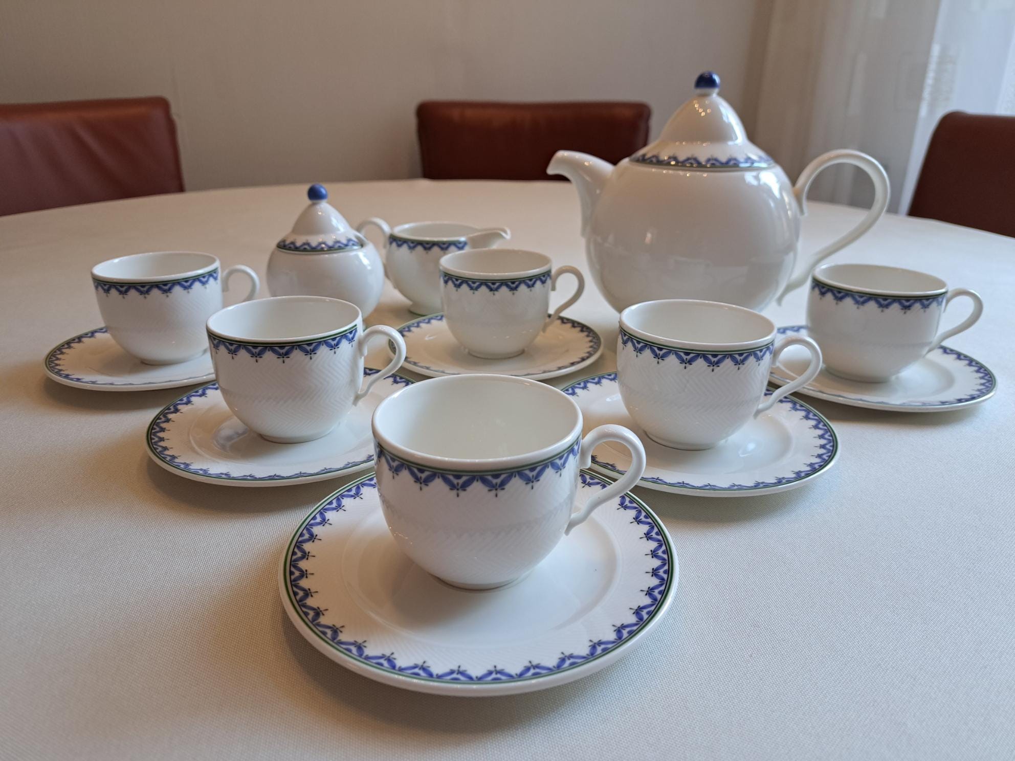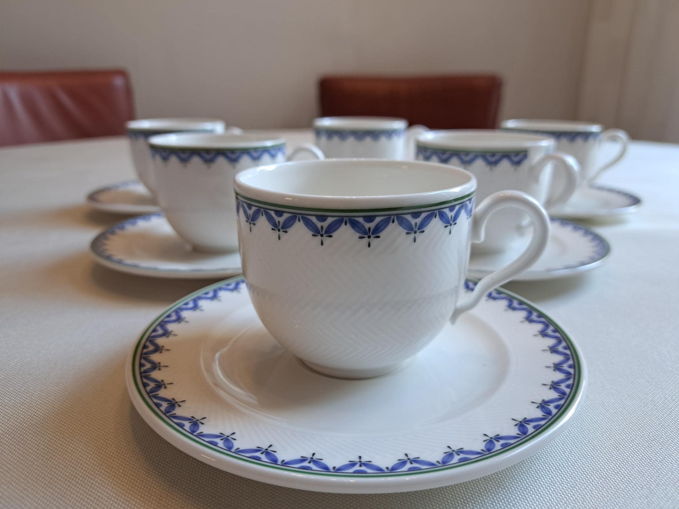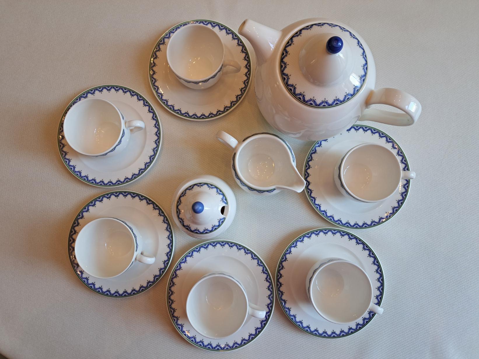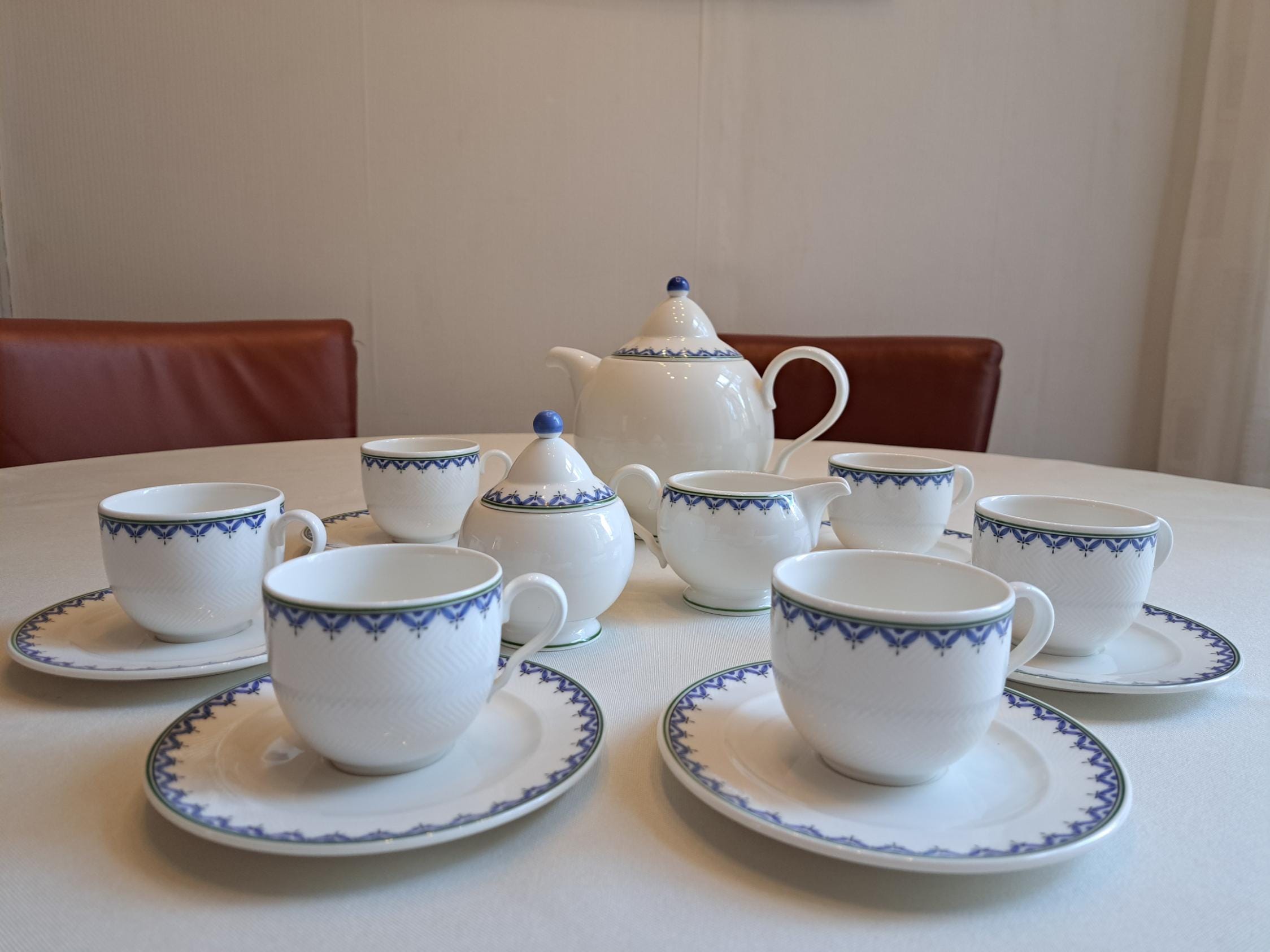 Classically designed tableware in the Look shape, white with a blue leaf edge.