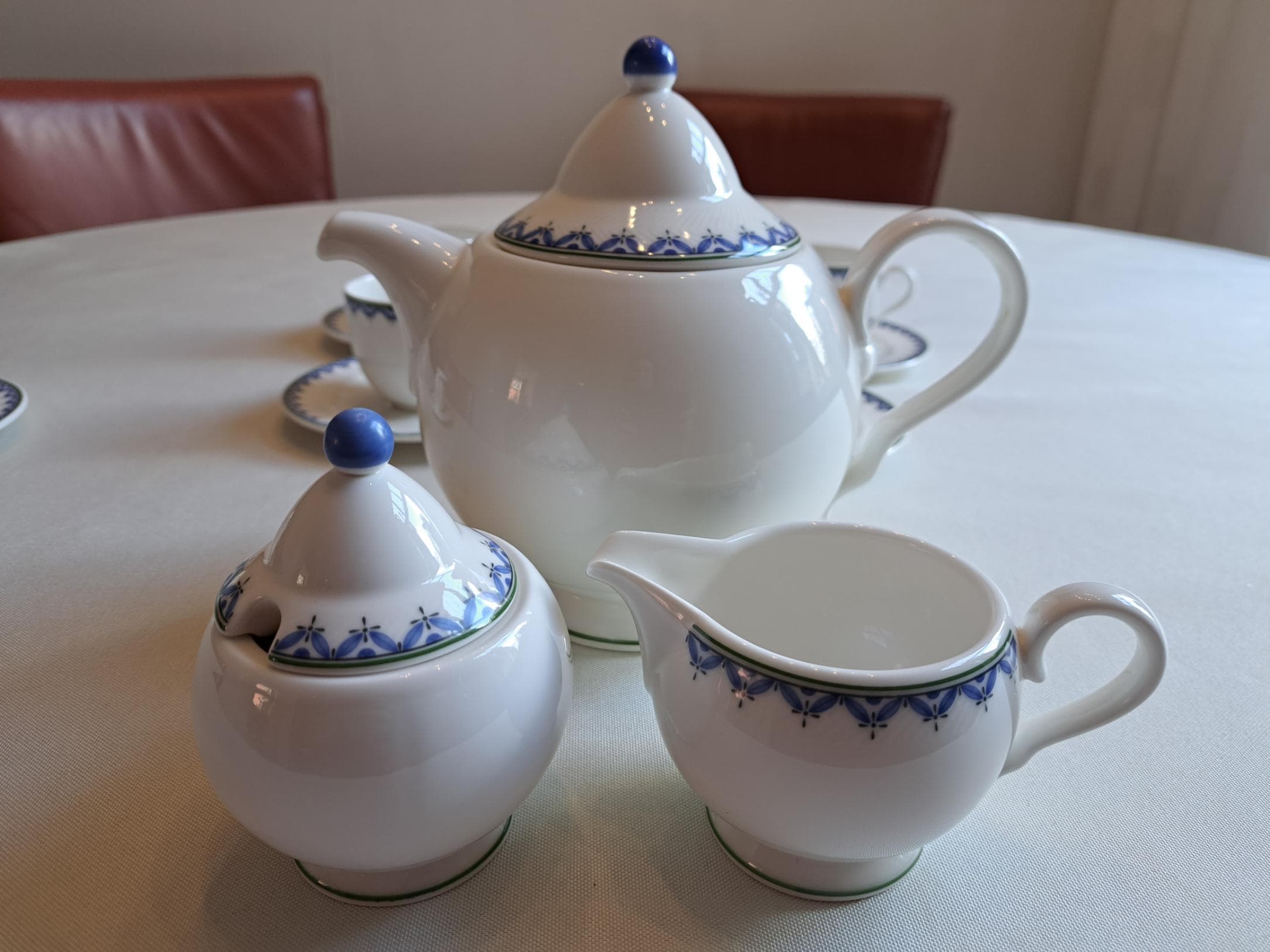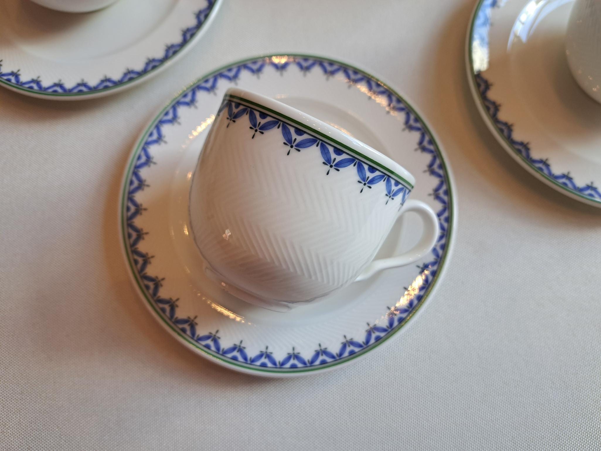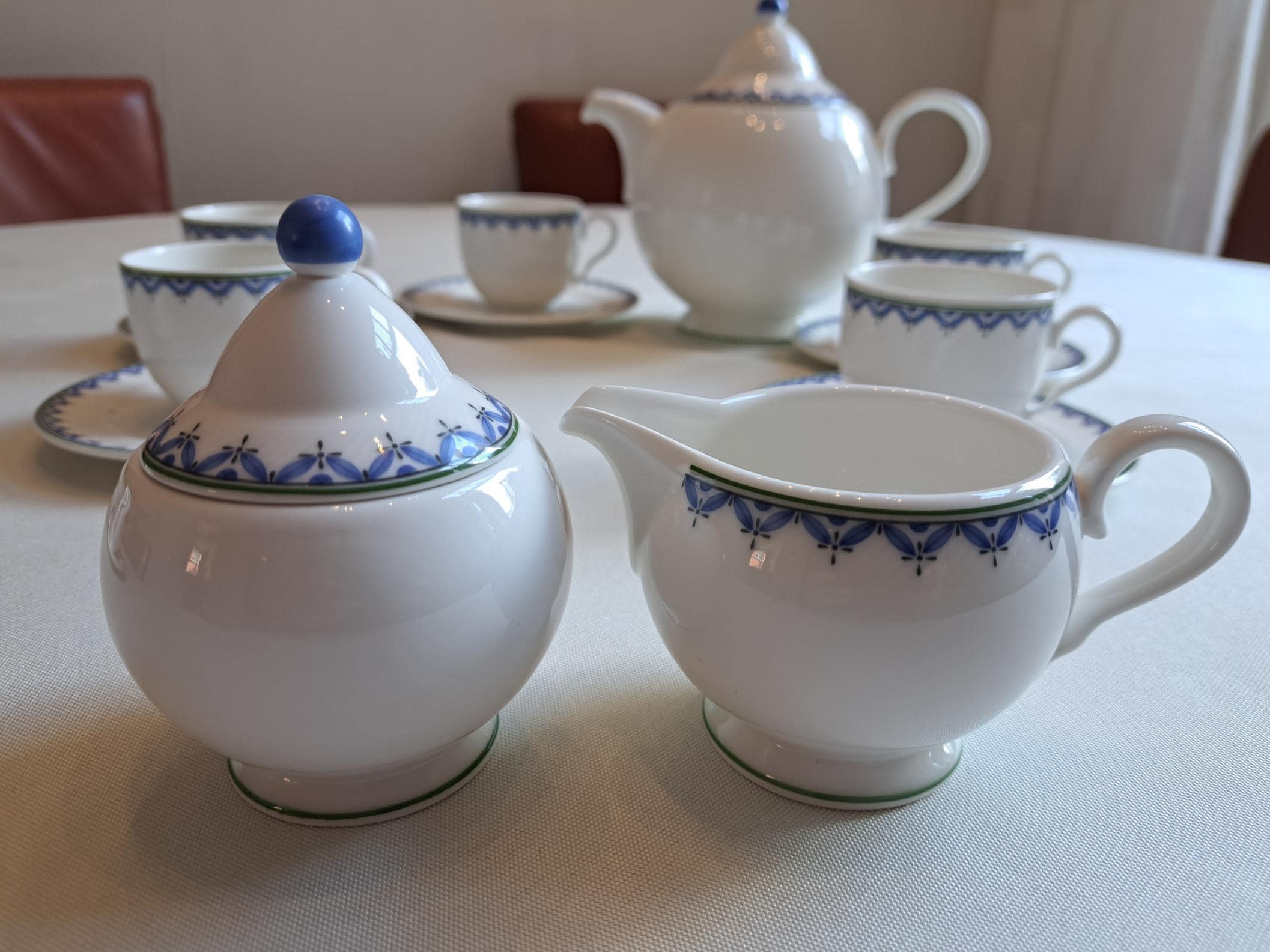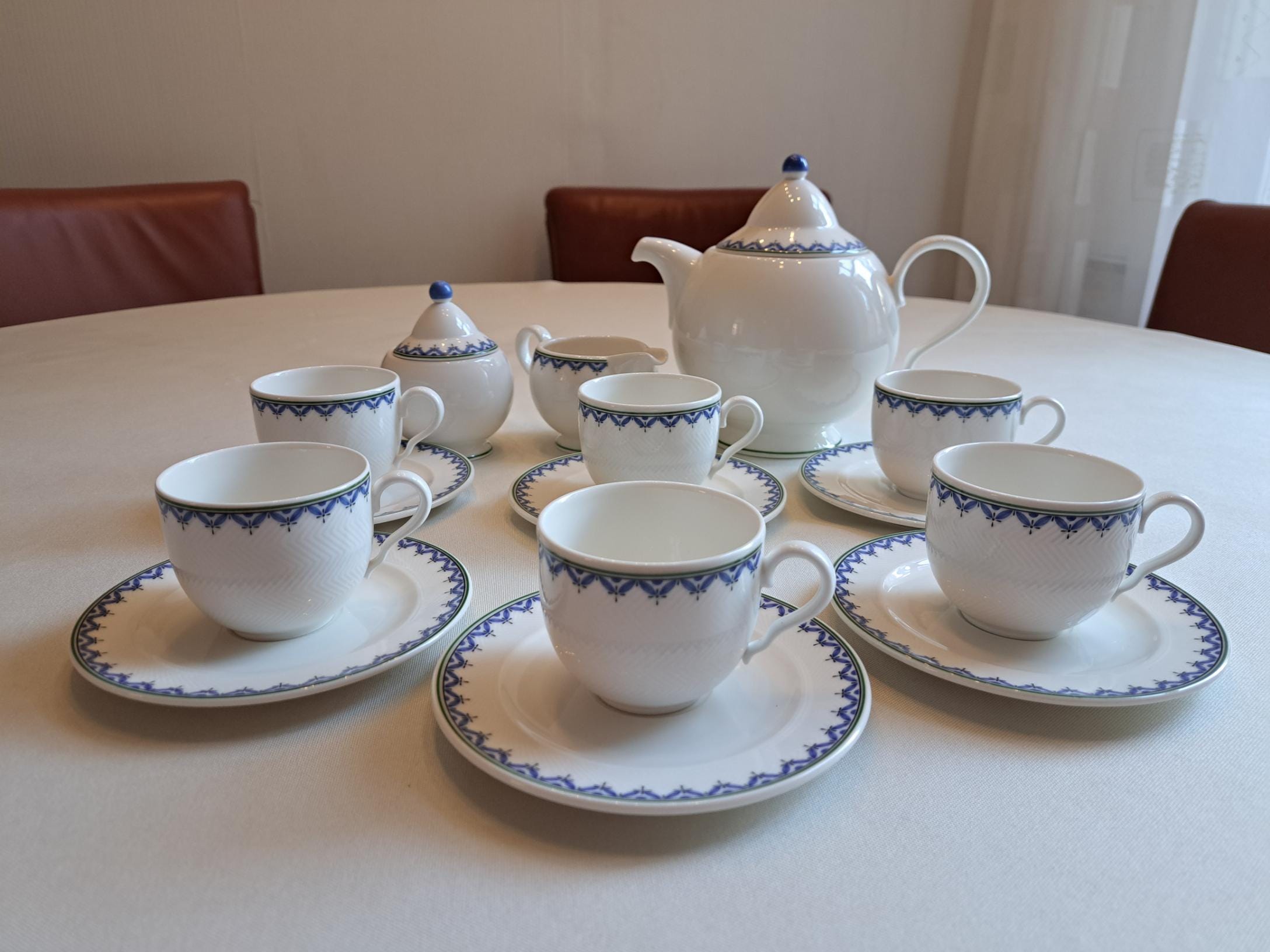 Classically designed tableware in the Look shape, white with a blue leaf edge.